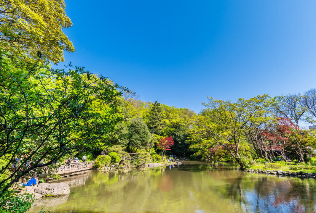- This is a park that has a very long history. From the high ground of the Tokyo Metropolitan Central Library on the east side, the park terrain slopes downhill toward the west side, blending a pleasant diversity of scenes such as a mountain stream, waterfall, and a pond graced by domestic and wild ducks.